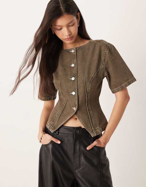 ASOS DESIGN – Kragenloses, kurzärmliges Oberteil aus Denim in Olivgrün mit tailliertem Schnitt