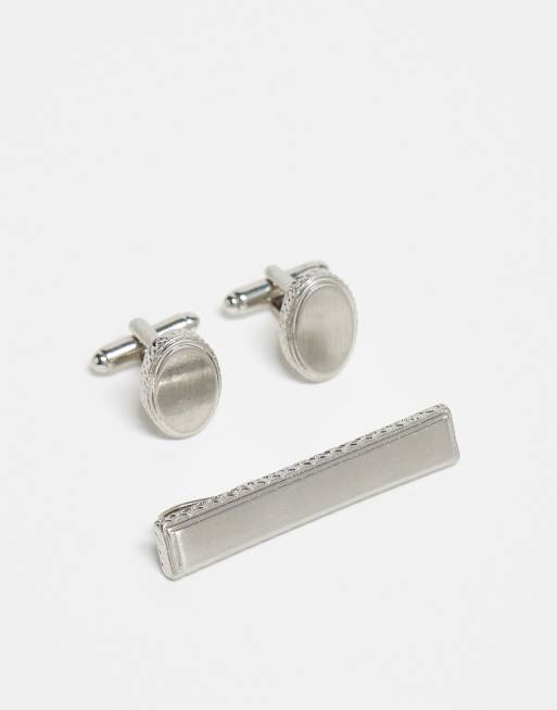 ASOS DESIGN – Krawattennadel und Manschettenknöpfe im Set in angerauter Silber-Optik