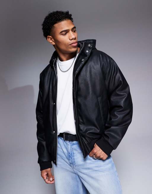 ASOS DESIGN – Kunstleder-Bomberjacke in Schwarz mit Kapuze