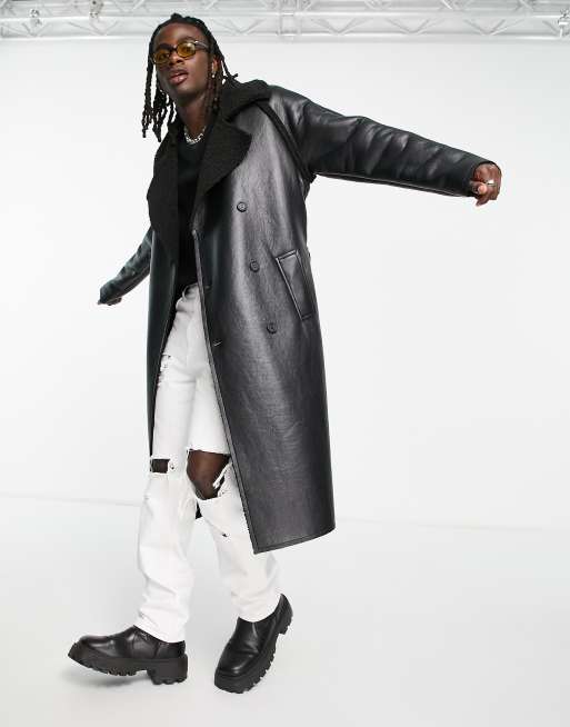 ASOS DESIGN – Kunstleder-Trenchcoat mit Teddyfutter in Schwarz