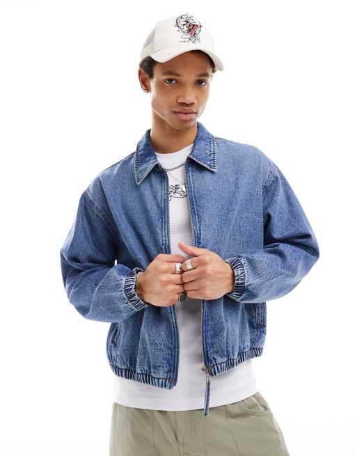 ASOS DESIGN – Kurz geschnittene Jeansjacke im Harrington-Stil in verwaschenem Mittelblau