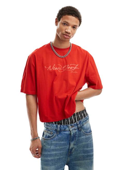 ASOS DESIGN – Kurz geschnittenes Oversize-T-Shirt in Rot mit „New York“-Print