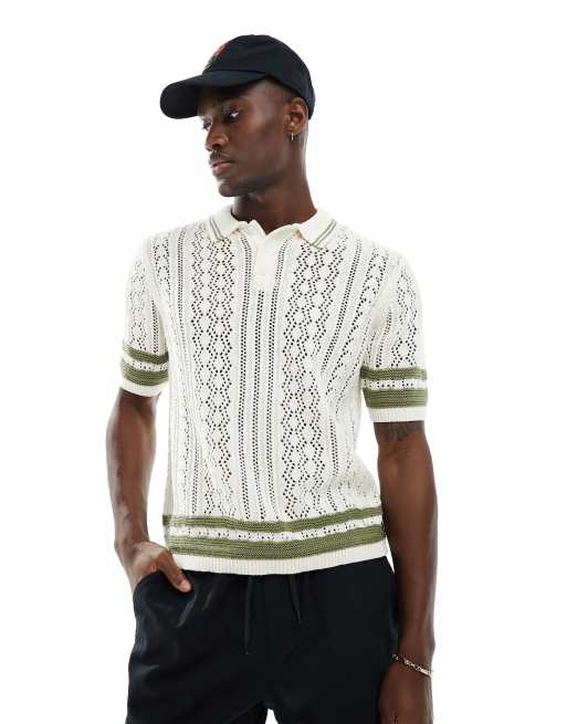 ASOS Design – Kurz geschnittenes Strick-Poloshirt in Wollweiß mit Zierstreifen