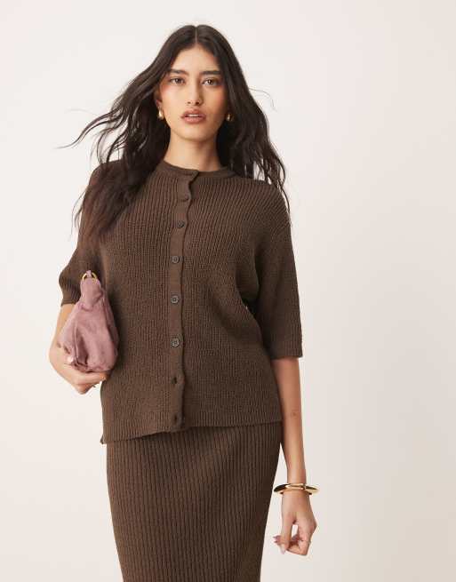 ASOS DESIGN – Kurzärmeliges Bouclé-Strickjacke in Schokobraun, Kombiteil