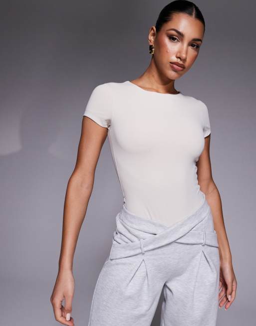 ASOS DESIGN – Kurzärmliger, modellierender und hochgeschlossener Body aus hochwertigem Material in Steinbeige mit Rundhalsausschnitt