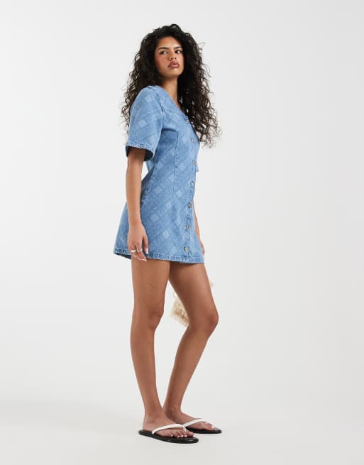 ASOS DESIGN – Kurzärmliges Jeanskleid mit V-Ausschnitt und Laser-Karomuster