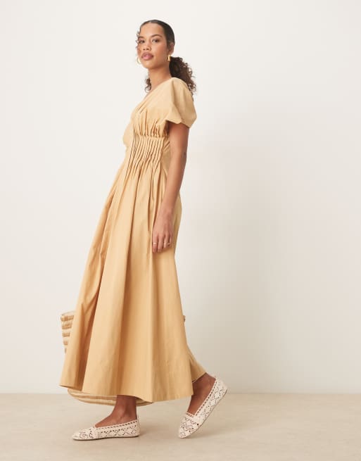 ASOS DESIGN – Kurzärmliges Midikleid in Steinbeige mit V-Ausschnitt und schmalen Biesen