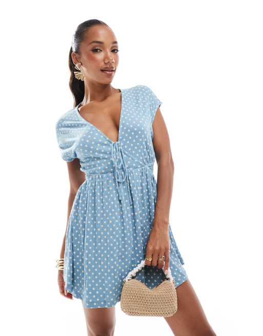 ASOS DESIGN – Kurzärmliges Mini-Freizeitkleid in gepunktetem Blau mit V-Ausschnitt, Knitterstruktur und gebundener Vorderseite