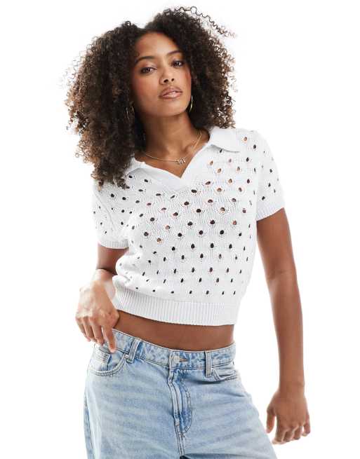 ASOS DESIGN – Kurzärmliges Polohemd aus Strick in Optisch-Weiß mit Maschendetail