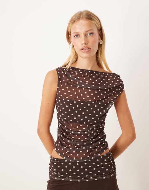ASOS DESIGN – Kurzärmliges schulterfreies Oberteil aus gerafftem Netzstoff in Schokobraun mit Polka Dots, Kombiteil