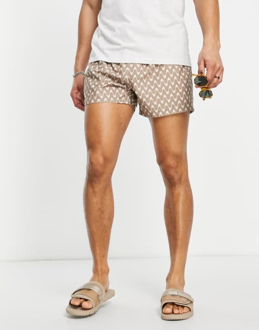 ASOS DESIGN – Kurze Badeshorts in Beige mit Winkelstreifenmuster