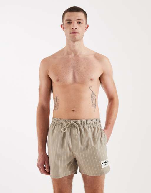ASOS DESIGN – Kurze Badeshorts in gestreiftem Beige mit Aufnäher