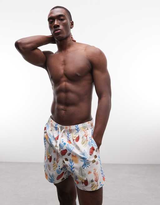 ASOS DESIGN – Kurze Badeshorts mit buntem Riff-Muster