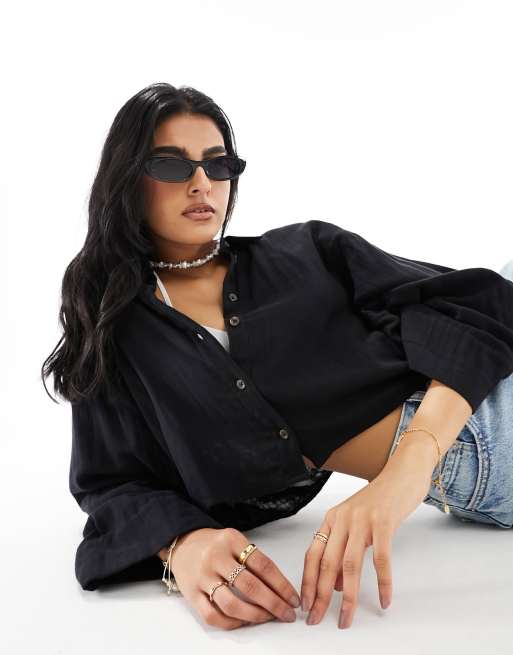 ASOS DESIGN – Kurze Hemdbluse aus grob gewebter Baumwolle in Schwarz