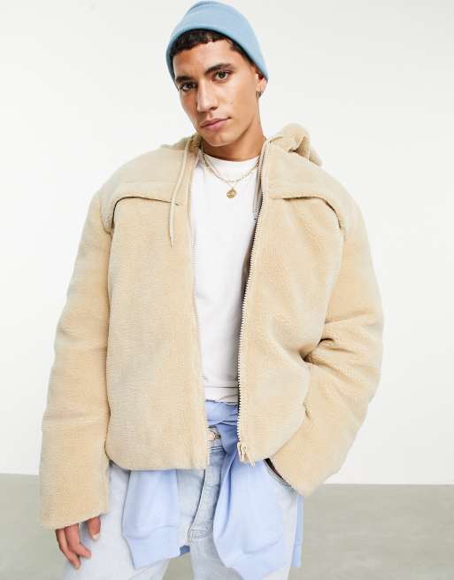ASOS DESIGN – Kurze Pufferjacke aus Teddyfell mit Stickerei hinten in Steinbeige
