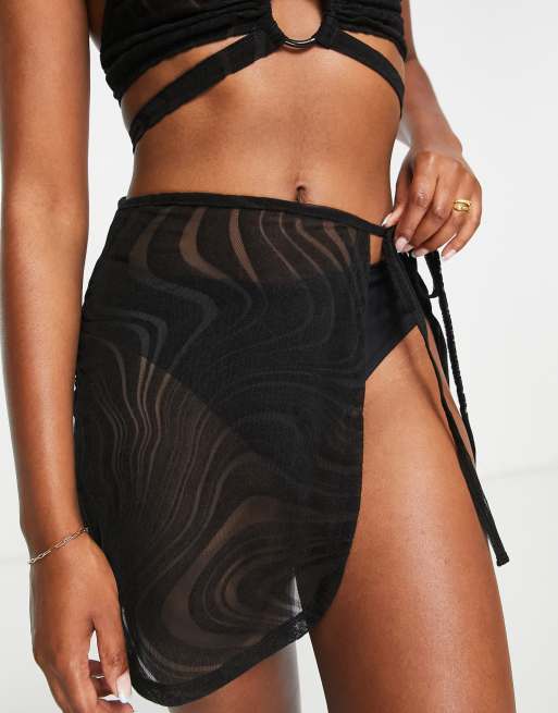 ASOS DESIGN – Kurzer Strand-Sarong aus beflocktem Netzstoff in Schwarz, Kombiteil