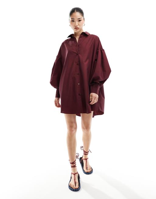 ASOS DESIGN – Kurzes Hemdblusenkleid in Burgunderrot mit Boyfriend-Schnitt und Blousonärmeln