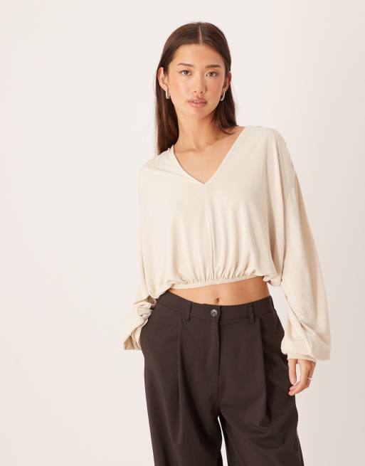 ASOS DESIGN – Kurzes Modal-Oberteil in Kokosmilch-Weiß mit Ballonärmeln und V-Ausschnitt