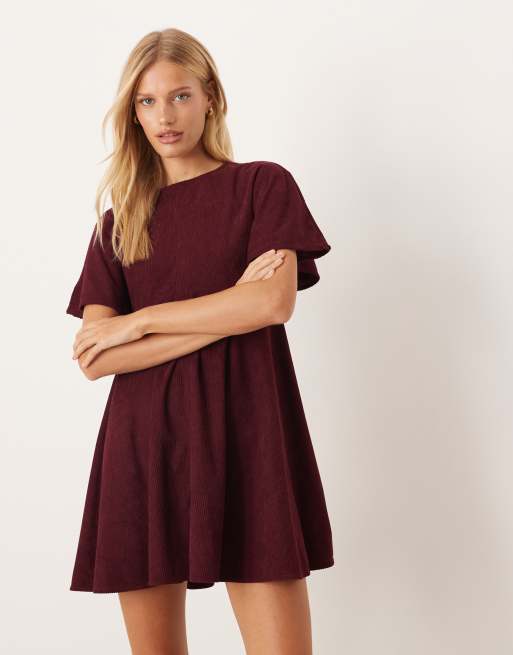 ASOS DESIGN – Kurzes T-Shirt-Kleid aus Cord in Pflaume mit Ziernähten