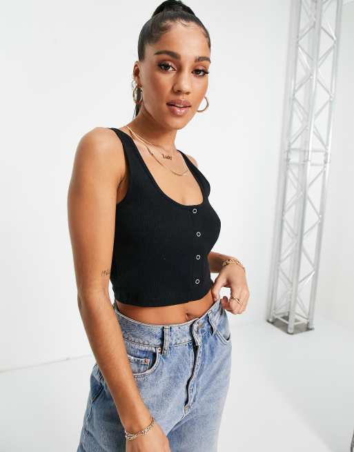 ASOS DESIGN – Kurzes Trägertop mit Druckknopf-Front in Schwarz