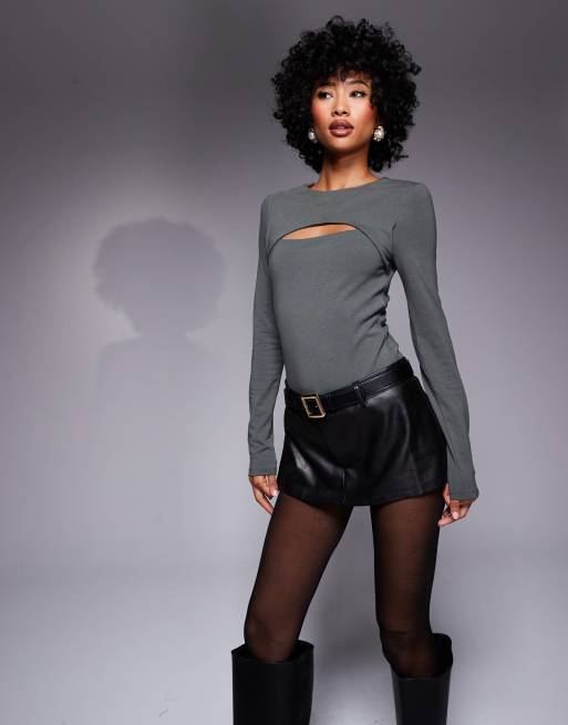 ASOS DESIGN – Langärmliger Body in Khaki mit Schlitzausschnitt