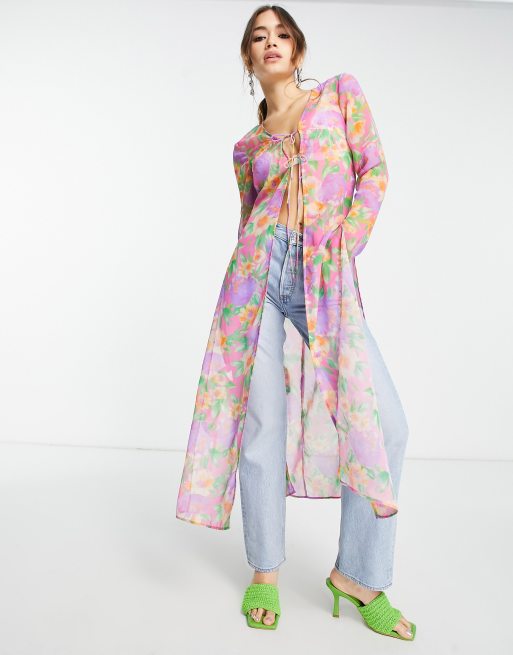 ASOS DESIGN – Langärmliger, durchscheinender Maxi-Kimono in Rosa mit hellem Print und Schnürung vorne