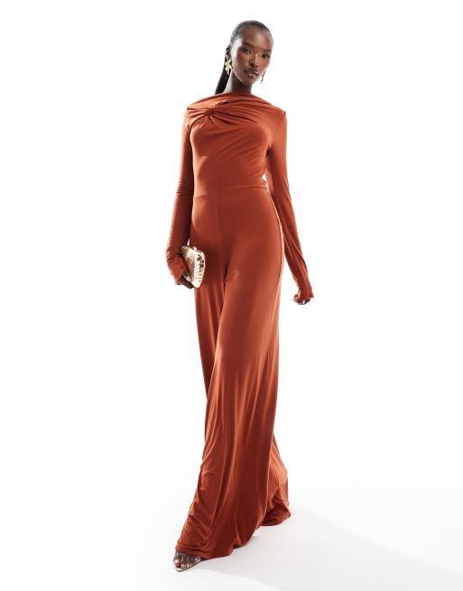 ASOS DESIGN – Langärmliger Jumpsuit in Rostrot mit Knotendetail
