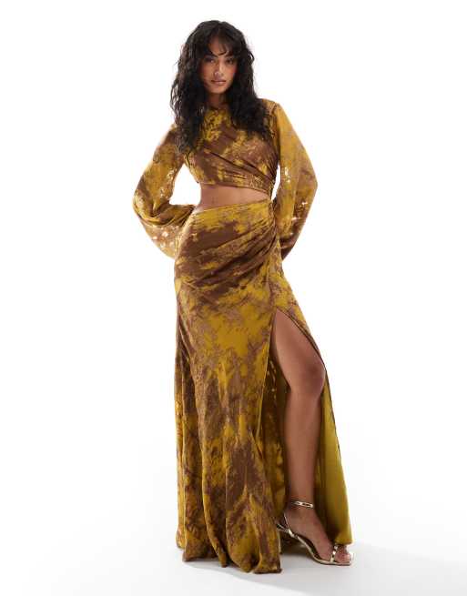 ASOS DESIGN – Langärmliges, asymmetrisch geschnittenes Maxikleid mit Zierausschnitt und abstraktem Ausbrenner-Muster
