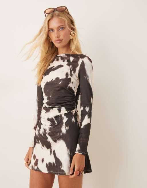 ASOS DESIGN – Langärmliges, ausgestelltes Minikleid mit Kuhfellmuster