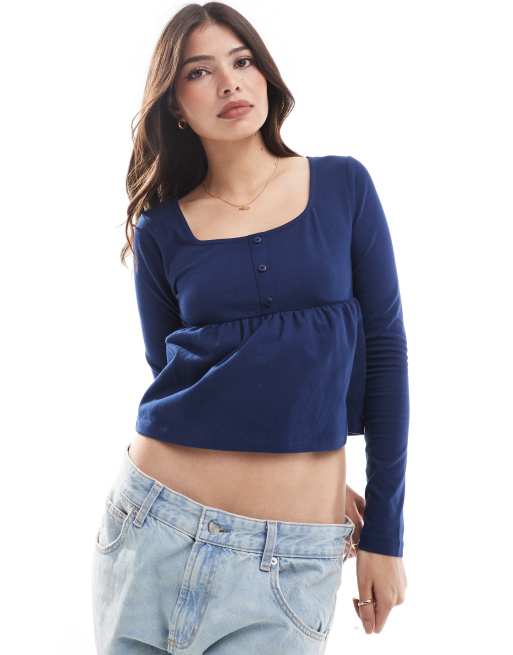 ASOS DESIGN – Langärmliges Babydoll-Top in Marineblau mit Henley-Ausschnitt