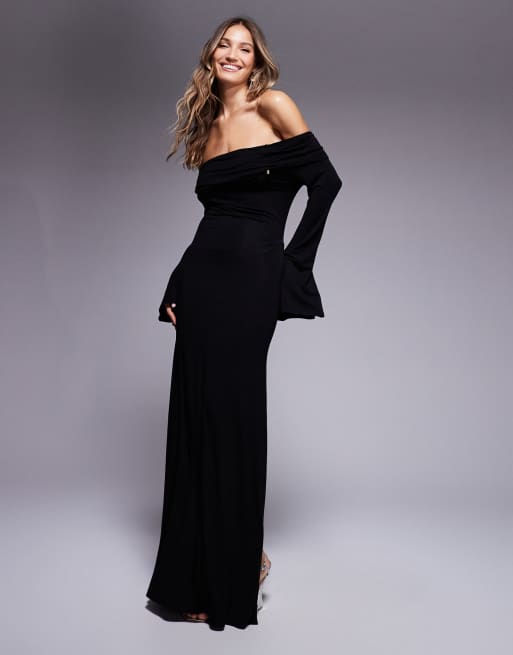 ASOS DESIGN – Langärmliges Bardot-Midikleid in Schwarz mit goldfarbener Verzierung und gerafften Details
