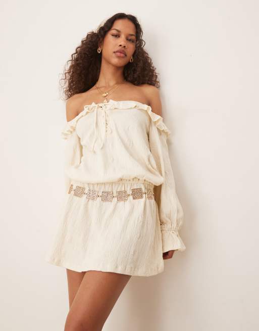 ASOS DESIGN – Langärmliges Boho-Minikleid in Creme mit Carmen-Ausschnitt