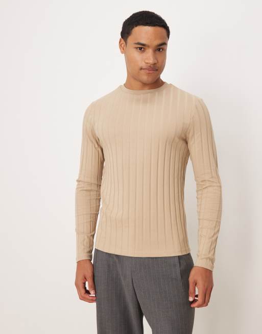 ASOS DESIGN – Langärmliges, breit geripptes T-Shirt in Beige mit schmaler Passform