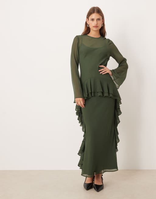 ASOS DESIGN – Langärmliges Chiffon-Maxikleid in Dunkelgrün mit Rüschensaum