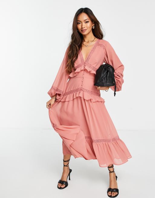 ASOS DESIGN – Langärmliges, durchgeknöpftes Midikleid in Rosé im Stufendesign mit Spitzeneinsätzen