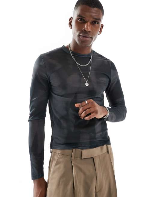 ASOS DESIGN – Langärmliges, gemustertes Netzstoff-Shirt mit engem Schnitt