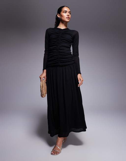ASOS DESIGN – Langärmliges, geripptes Maxikleid in Schwarz mit geraffter Vorderseite