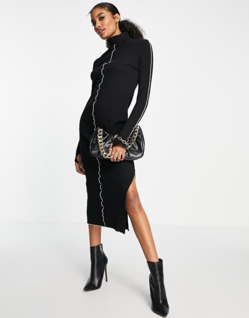 ASOS DESIGN – Langärmliges, geripptes Maxikleid in Schwarz mit Kontrastnaht