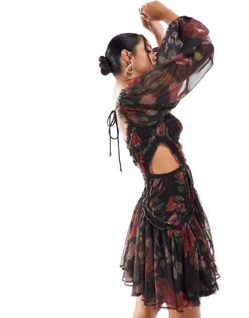 ASOS DESIGN – Langärmliges, gesmoktes Minikleid mit Rosenmuster, Korsettdetail und Zierausschnitten