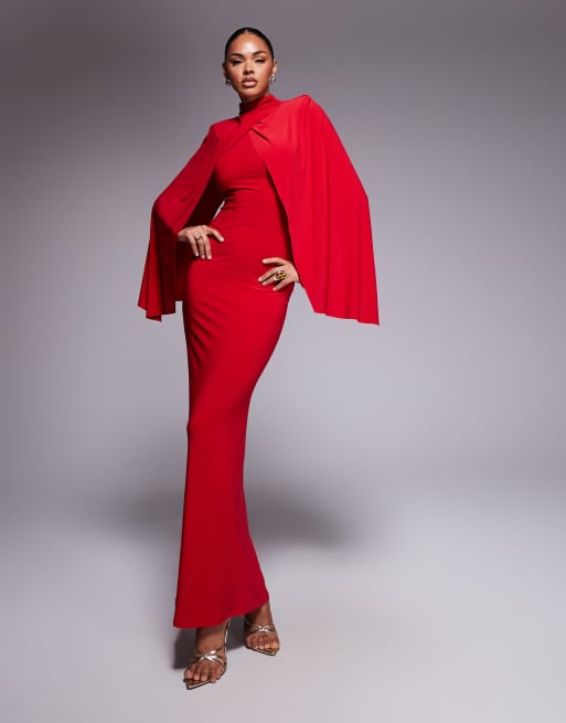 ASOS DESIGN – Langärmliges, hochgeschlossenes Maxikleid in Rot mit Wickel-Effekt