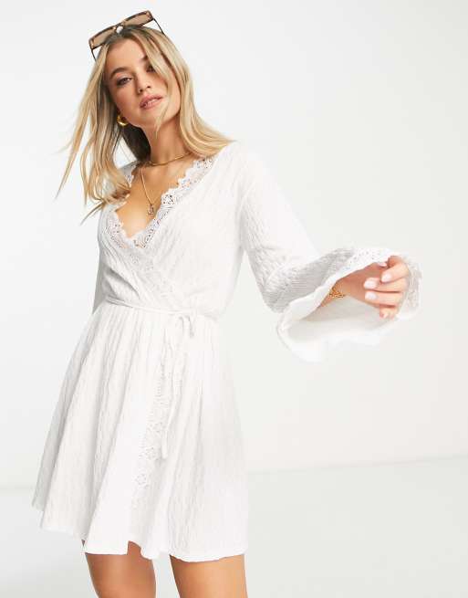 ASOS DESIGN – Langärmliges, kurzes Wickelkleid in Weiß mit Häkelborte