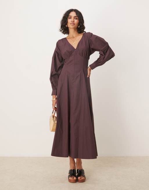 ASOS DESIGN – Langärmliges Maxikleid aus Popeline in Schokobraun mit V-Ausschnitt