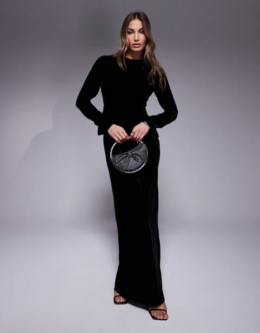 ASOS DESIGN – Langärmliges Maxikleid aus schwarzem Samt mit eingestecktem, asymmetrischem Saum