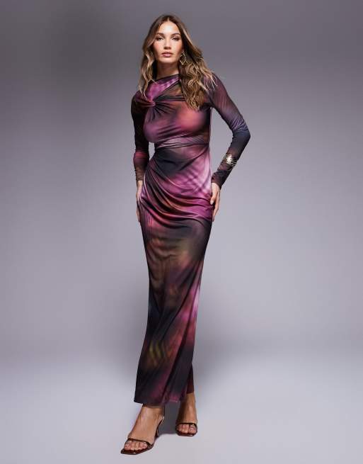 ASOS DESIGN – Langärmliges Maxikleid in Lila mit Knotendetail und abstraktem Muster