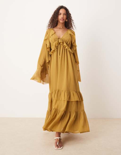 ASOS DESIGN – Langärmliges Midaxi-Kleid in Olivgrün mit V-Ausschnitt und Bindedetails