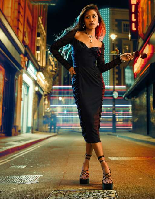 ASOS DESIGN – Langärmliges Midikleid aus Netzstoff mit gerafften Details in Schwarz