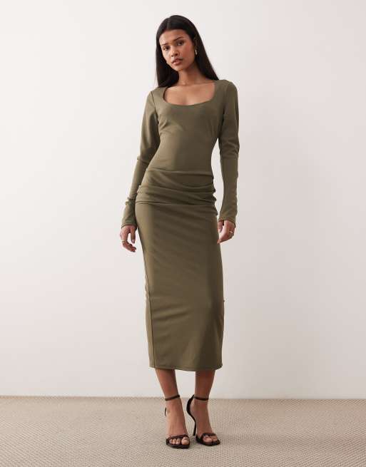 ASOS DESIGN – Langärmliges Midikleid in Khaki mit U-Ausschnitt und geraffter Taille