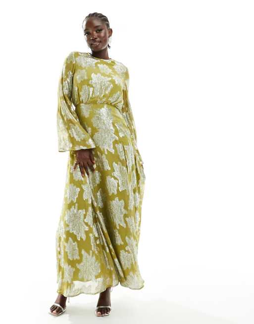 ASOS DESIGN – Langärmliges Midikleid in Metallic-Chartreuse mit gerüschten Ärmelbündchen