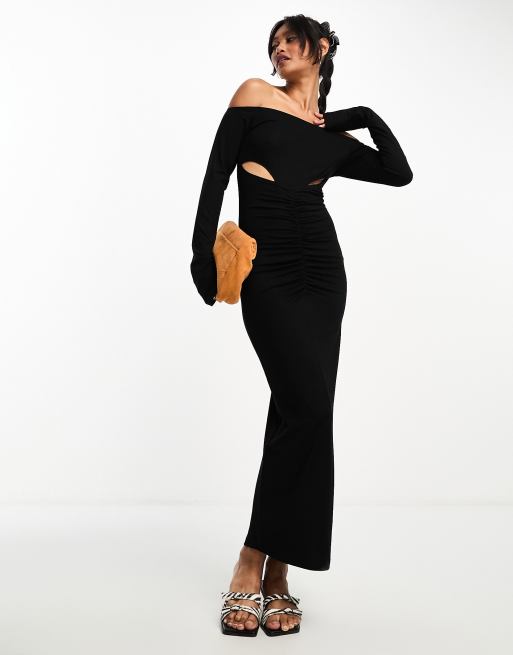 ASOS DESIGN – Langärmliges Midikleid in Schwarz mit Carmen-Ausschnitt, geraffter Vorderseite und Zierausschnitten