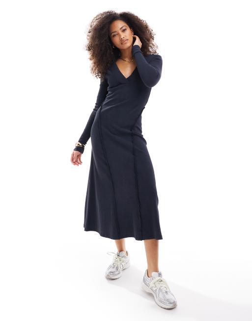 ASOS DESIGN – Langärmliges Midikleid in verwaschenem Schwarz mit weitem Saum